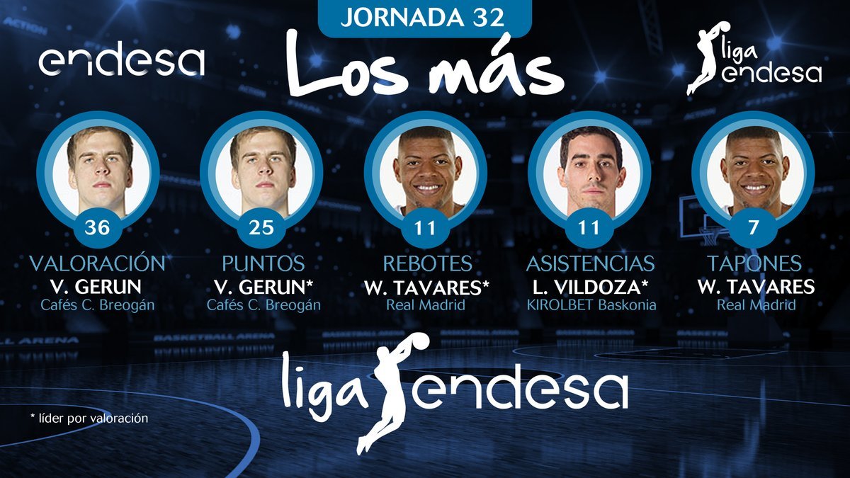 Центровий збірної України Володимир Герун став найціннішим гравцем 32-го туру чемпіонату Іспанії. У поєдинку проти «Гран Канарії» (77:92) Герун за 28 хвилин на паркеті набрав 25 очок (9/14 двоочкових, 7/8 штрафних) і зробив 7 підбирань. Його рейтинг ефективності склав 36 балів.