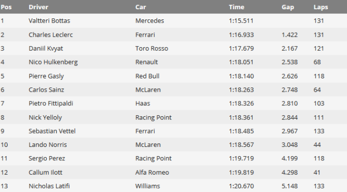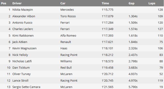 Вчорашній і сьогоднішній дні кращий час показали пілоти Мерседеса, випередивши найближчих переслідувачів більш ніж на секунду. У вівторок за кермом знаходився Валттері Боттас, а в середу шанс протестувати болід отримав Микита Мазепін.