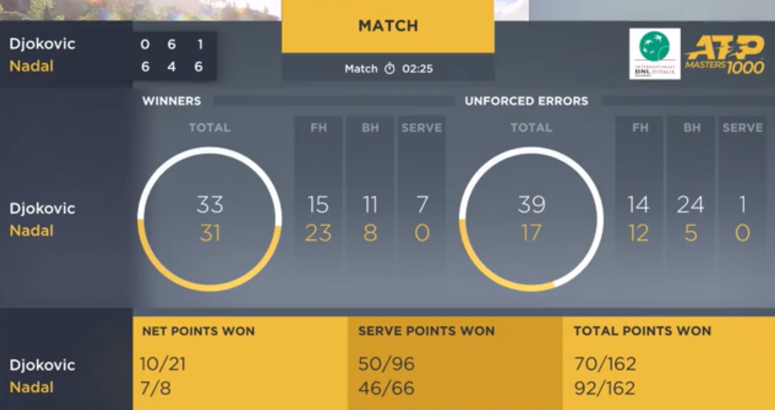 Додамо, що для Надаля це був 50-й фінал турнірів серії Мастерс, 34 з них він виграв. У Джоковича 33 титули і 49 фіналів. Третім йде Роджер Федерер, який має 28 перемог на турнірах даної категорії.