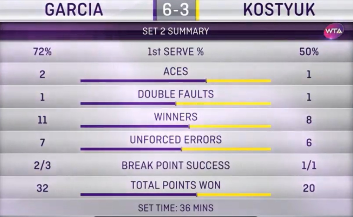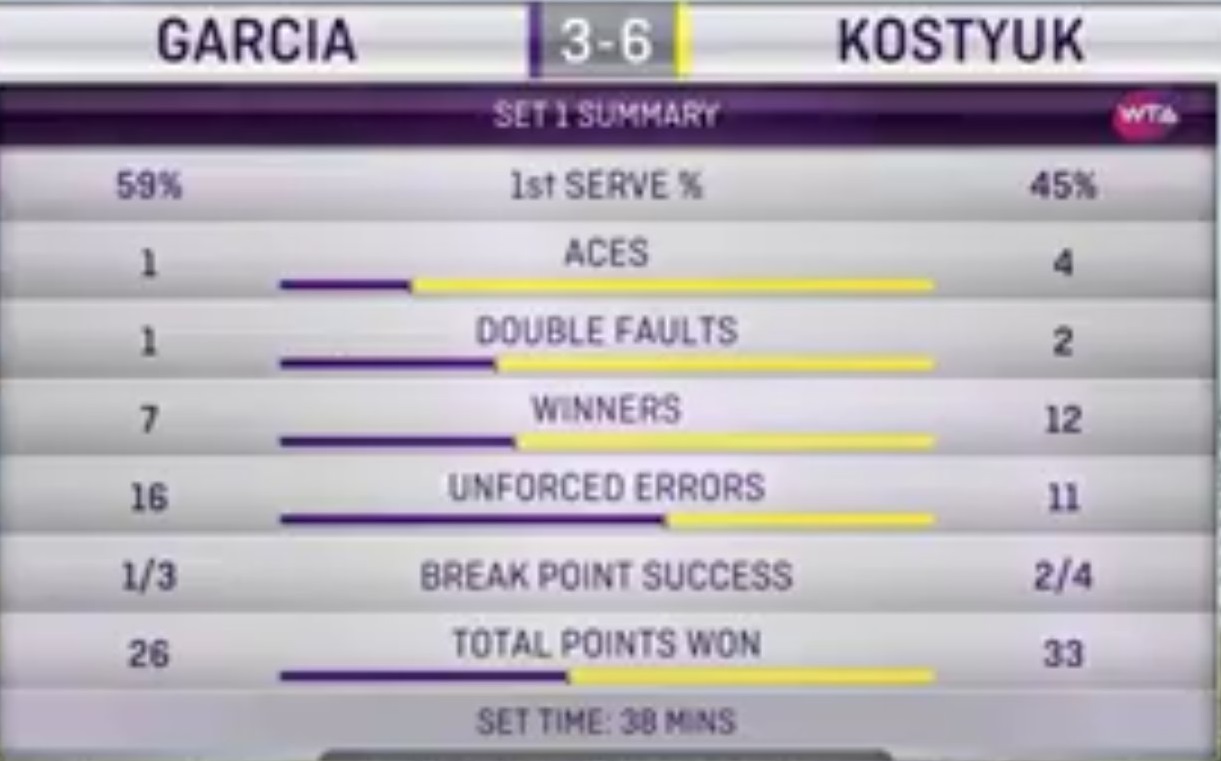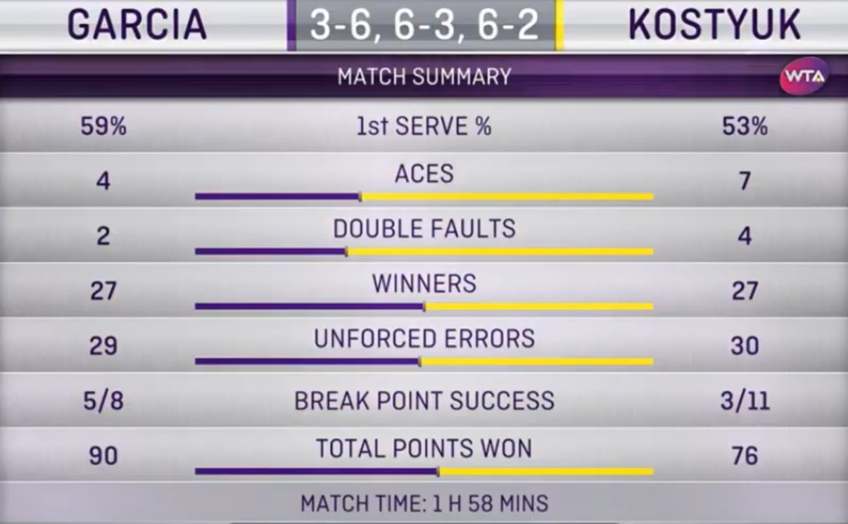 Сьогоднішній матч, незважаючи на результат, продемонстрував, що Костюк повернулася на свій високий в минулому рівень. З самого початку зустрічі вона стала грати проти Гарсії дуже сміливо, до чого суперниця була не зовсім готова. Француженка явно не очікувала такого рівня опозиції, через що в результаті ледь не програла поєдинок.