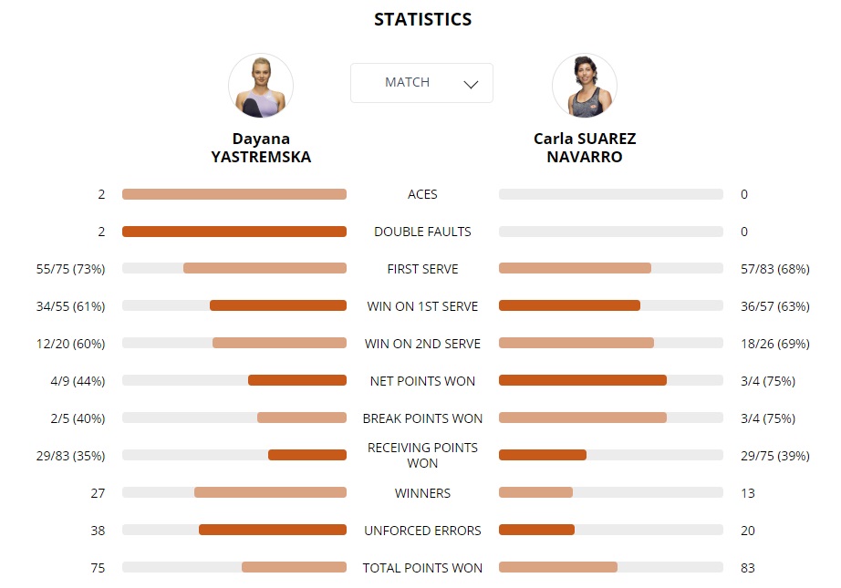 Даяна Ястремська (Україна) - Карла Суарес Наварро (Іспанія) - 6:2, 6:7(0), 0:6