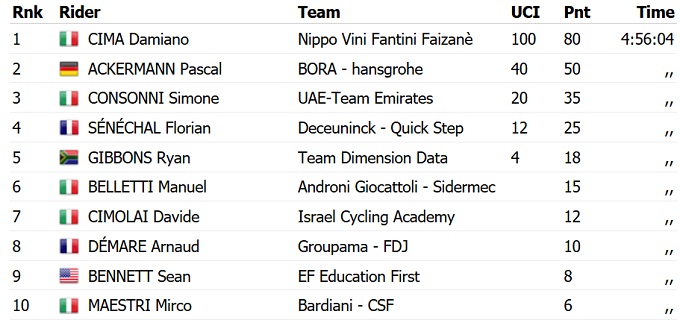 Дам’яно Чіма в напруженій боротьбі з відриву виграв 18-й етап Джиро д'Італія-2019, встигнувши фінішувати на мить раніше пелотону. Другим став Паскаль Аккерманн, який перехопив лідерство в спринтерському заліку.