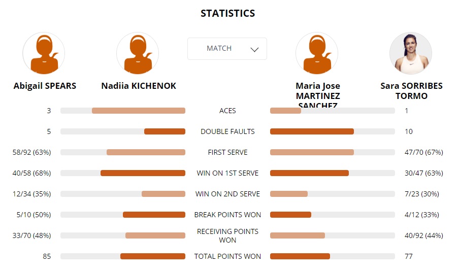 У поєдинку другого кола українка в дуеті з Абігейл Спірс з США обіграла іспанський дует Марія-Хосе Мартінес-Санчес / Сара Соррібес-Тормо.