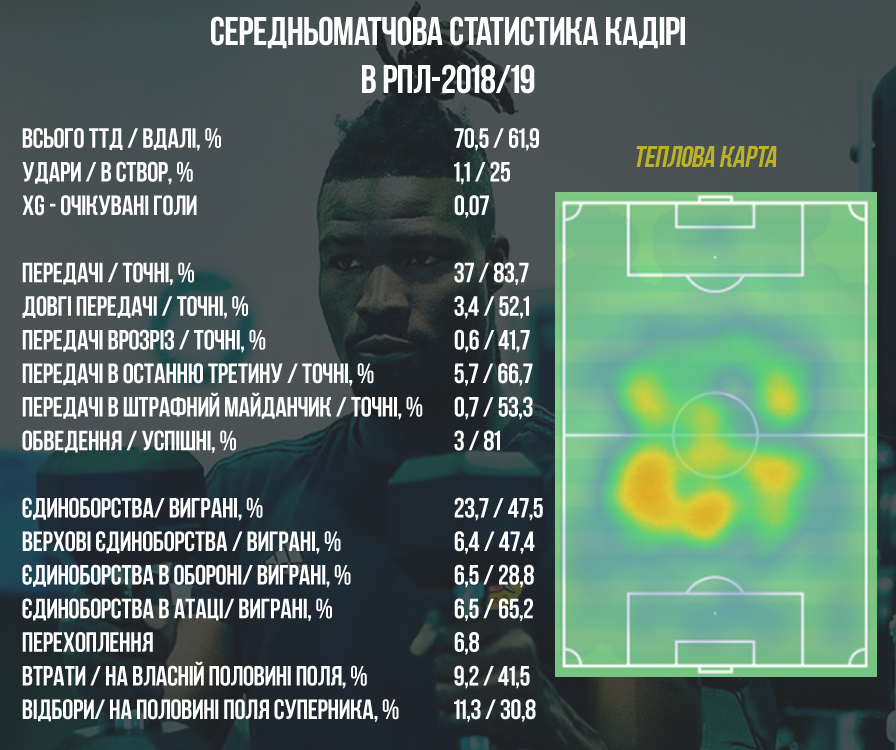 У той же час Мохаммед Кадірі виглядає досить обмеженим футболістом з точки зору роботи на атаку. Від нього ви не дочекаєтеся величезної кількості обведень – такі дії ганський гравець дозволяє собі в основному тільки тоді, коли впевнений в їх підсумковій успішності. Не випадково відсоток вдалих обведень у Кадірі дуже високий і за цим компонентом ганський легіонер входив до трійки кращих в чемпіонаті Росії-2018/19. Ліпший відсоток успішних обведень був тільки у Романа Єременка (93%), а Ільзат Ахметов мав такий же показник в 80,95%, як і у Кадірі.