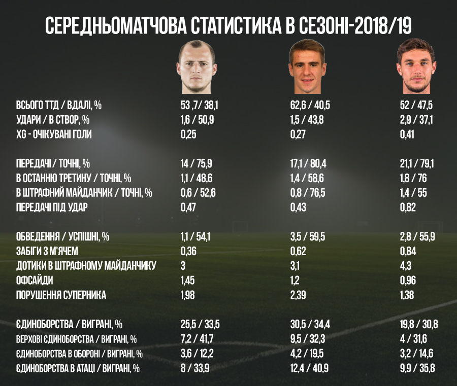Важливим є те, що навіть в більш сильнішій лізі Яремчук виявляє свою здатність бути гострішим та небезпечнішим за двох інших форвардів з нашої вибірки. В активі «українського бельгійця» в середньому за матч практично вдвічі більше ударів по воротах суперників, хоча з відсотком точності справи йдуть не дуже. Однак саме Яремчук виглядає найбільш переважно, якщо брати до уваги збірно-усереднений показник очікуваних голів (xG). Зозуля та Бєсєдін в цьому компоненті знаходяться приблизно на одному рівні.