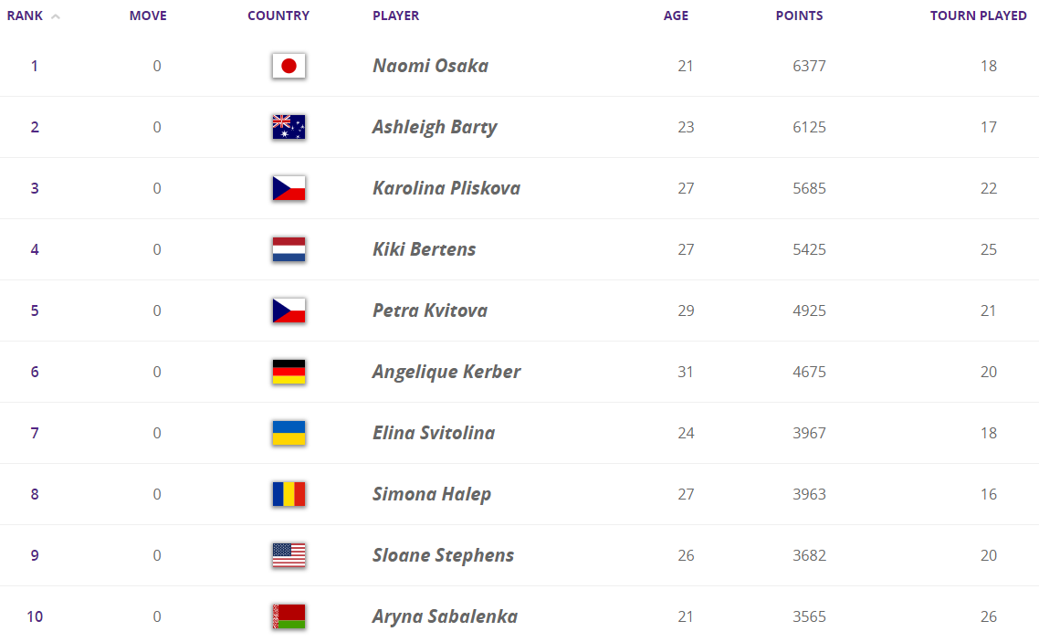 Попередній тиждень у жінок пройшов на кортах Ноттінгема і Гертоґенбоса. Переможниця турніру в Великобританії Каролін Гарсія піднялася на 5 позицій і тепер вона 23-я. Завдяки цьому в топ-30 відбулися хоч якісь зміни. Тріумфаторка турніру в Нідерландах Елісон Ріск повернулася в топ-50 і тепер займає 49-у позицію.