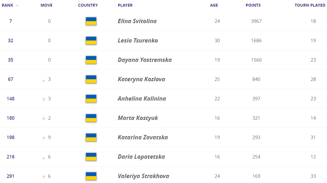 Рейтинг WTA. Світоліна, Цуренко і Ястремська зберегли позиції