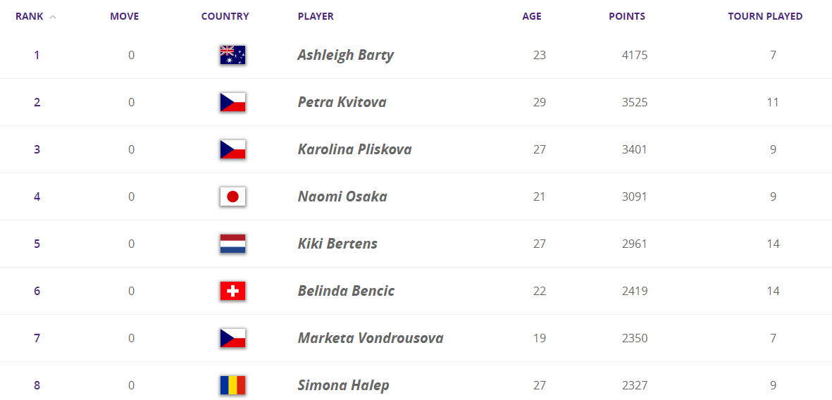 В чемпіонській гонці перша вісімка залишилася без змін. Еліна Світоліна на 12-й позиції, Даяна Ястремська - на 30-й, Леся Цуренко - 35-й.