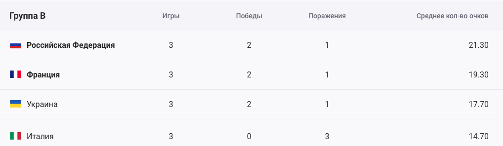 Відзначимо, що відразу у трьох команд - Росії, Франції та України однакова кількість перемог (2). Але українська збірна посіла третє місце, через низьку результативність на турнірі. У Росії і Франції середній показник набраних очок в матчах більше.