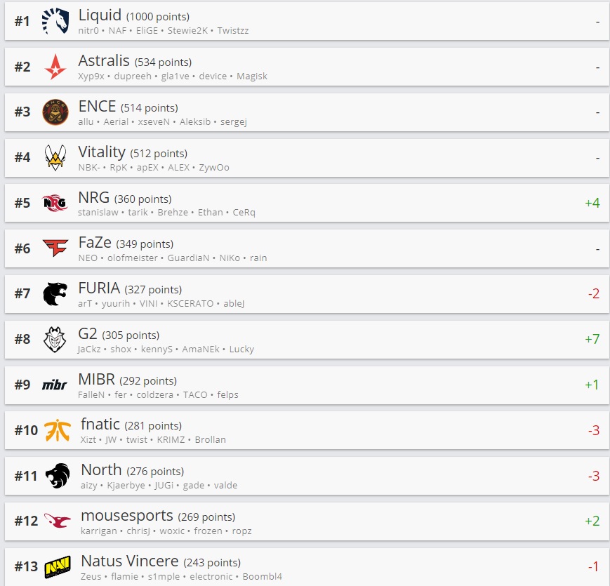 В оновленому рейтингу кращих команд по CS: GO за версією HLTV Team Liquid продовжує лідирувати. На рахунку команди 1000 очок, що майже на 500 більше, ніж у що йдуть другими Astralis.