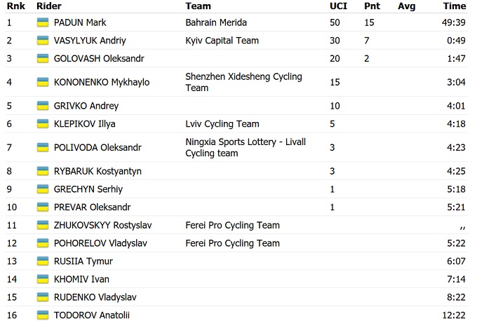 Вчора відбулася індивідуальна гонка з роздільним стартом на чемпіонаті України з шосейного велоспорту. Перемогу здобув єдиний представник України в Світовому турі - гонщик Bahrain Merida Марк Падун. Він випередив Андрія Василюка та Олександра Головаша.