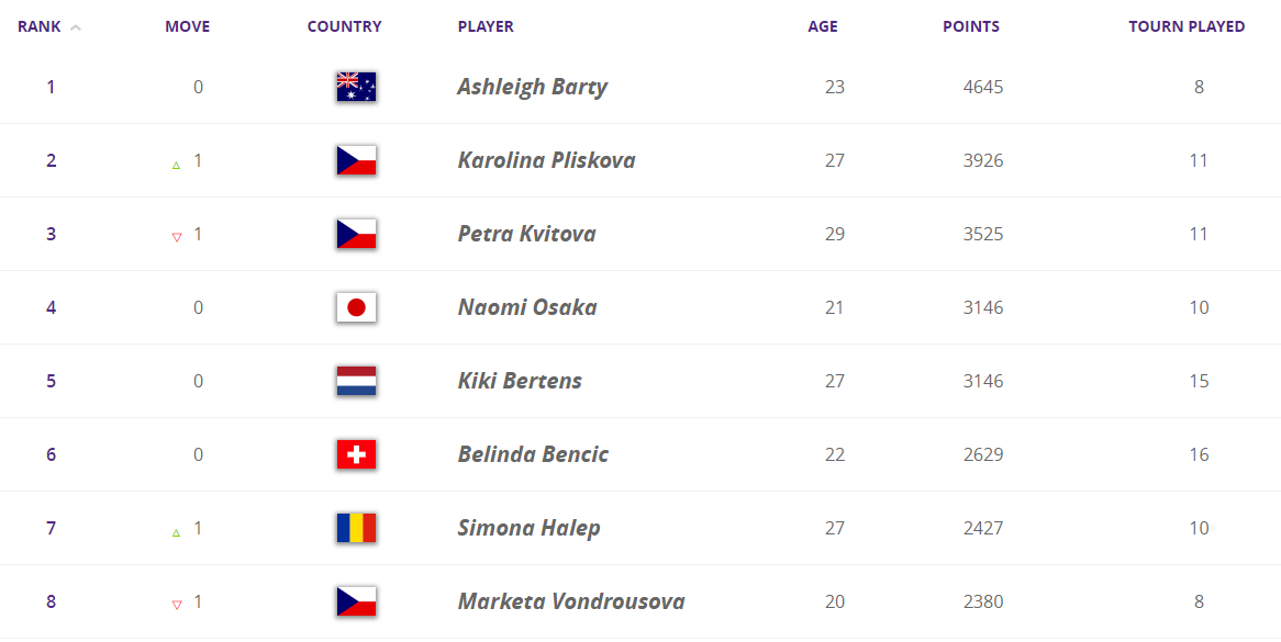 У першій десятці лише одна зміна: Соболенко не змогла захистити торішні очки і її десяте місце знову зайняла Серена Вільямс. Також відзначимо, що Маркета Вондроушова вперше зайшла в топ-15.