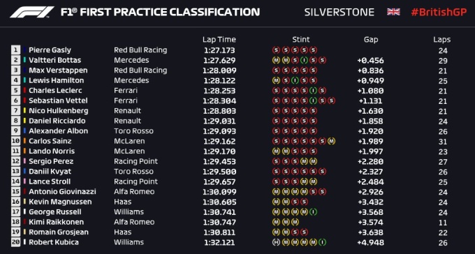 У першій практиці Гран-прі Великобританії несподівано найкращий час показав пілот Ред Булла Пьєрр Гаслі, який випередив Валттері Боттаса на 0,4 секунди.