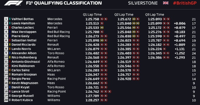 Фінн краще проїхав першу спробу, яка і стала вирішальною. Хемілтон допустив помилку в своїй першій спробі і відстав на 0,006 секунди. Шанс взяти поул мав Шарль Леклер, проте він, маючи кращий графік після двох секторів, на третьому зменшив хід і поступився 0,079 секундою.