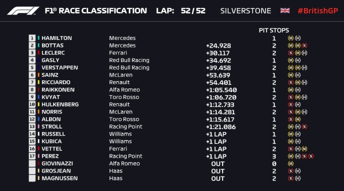 Гран-прі Великобританії почався з надзвичайно цікавою боротьби між напарниками по Мерседесу. Валттері Боттас зберіг лідерство, але Льюїс Хемілтон тут же на нього насів і хотів скоріше обігнати. І навіть обігнав, але Боттас повернув собі позицію! Класна боротьба, і коли фін втратив позицію, то здавалося, що все вирішено, але Валттері зумів красиво повернутися на 1-е місце. При цьому було видно, що Феррарі і Ред Булл абсолютно не тримаються в ритмі лідерів і відстають.