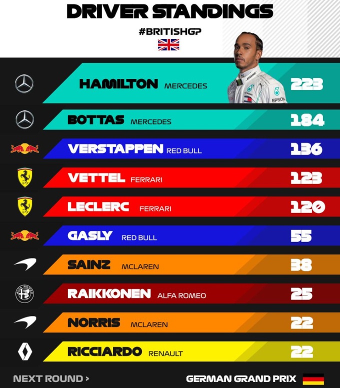 Не краща в плані інтриги і боротьба в загальному заліку. Льюїс Хемілтон не без везіння виграв гонку у Великобританії і збільшив відрив від Боттаса до 39 очок. Все ще не так багато, але з огляду на надійність машин Мерседеса і безпомилковість пілотування британця, Боттасу буде складно відігратися, якщо з напарником не трапиться який-небудь форс-мажор. Проте потрібно відзначити фінського гонщика.