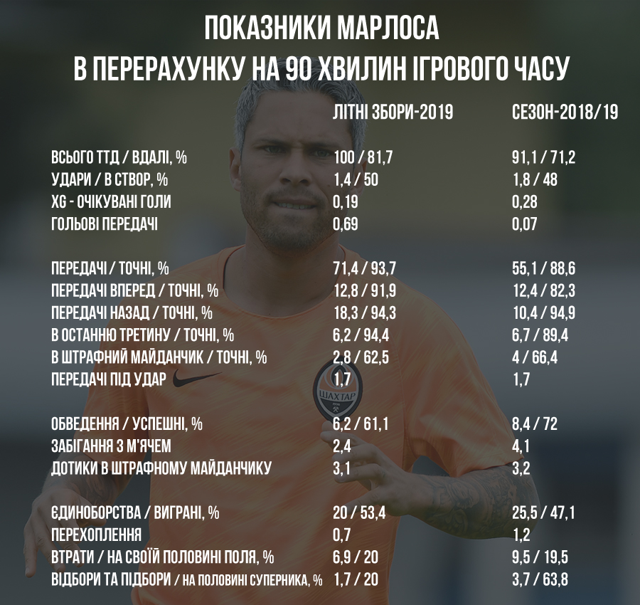 Принаймні, на зборах Марлос в центрі поля демонстрував на 10% більшу кількість техніко-тактичних дій, ніж в минулому сезоні на позиції правого вінгера. При цьому, навіть трохи більше, ніж на 10% виявилася вищою і успішність ТТД українського бразильця. Основу цього заклало зростання кількості передач у виконанні Марлоса - в середньому хавбек при переході в центр став виконувати на 16 пасів більше, ніж з позиції вінгера. Збільшилася і точність передач Марлоса - з 88,6% до вельми істотних 93,7%.