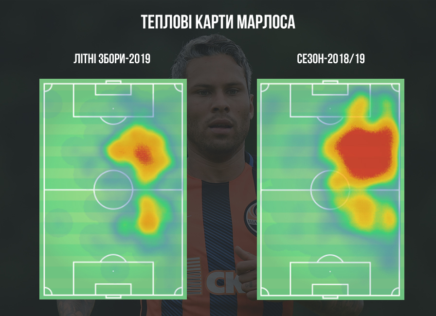 Оцінюючи теплові карти Марлоса в чотирьох матчах літніх зборів, коли він грав у центрі, та минулосезонних поєдинків, кидається в очі, що півзахисник при Каштру став значно рідше йти на саму «бровку», хоча його все одно незмінно тягне ближче до позиції на фланзі, яка стала такою рідною. При цьому, загальний контур конфігурації розташування Марлоса на полі в цілому чітко проглядається на обох теплових картах - найбільше український бразилець любить діяти ближче до границі останньої третини поля, а в штрафний майданчик входити по правому його кордону.