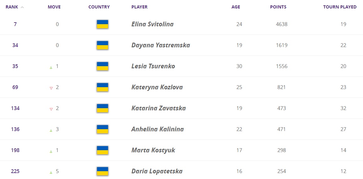 Що стосується українок, то Леся Цуренко піднялася на одну позицію за рахунок втрати очок китаянкою Чжан Шуай. Козлова і Завацька втратили по два рядки. Калініна, Костюк і Лопатецька трохи поліпшили позиції. Дві перші ракетки України залишилися на своїх місцях.