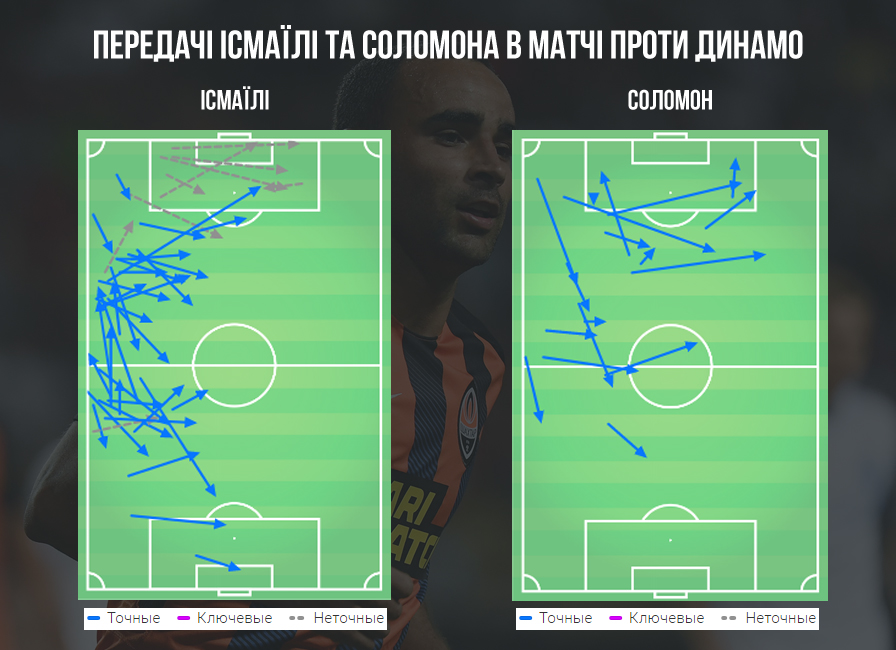 Соломон же й зовсім зіграв у кращих традиціях Веллінгтона Нема, який цього літа відбув в оренду в рідний «Флуміненсе». Перш за все, ізраїльтянин був малоактивним (тільки 34 ТТД за 69 хвилин при 68% їх успішності), а по-друге, діяв якось вкрай обережно та академічно. У передачах Соломона читалося виразне бажання не допустити помилку. У підсумку в його активі 18 пасів при їх 100% точності, однак переважна частина передач були спрямовані назад або поперек поля, а тому небезпеки воротам «Динамо» представляти не могли апріорі.