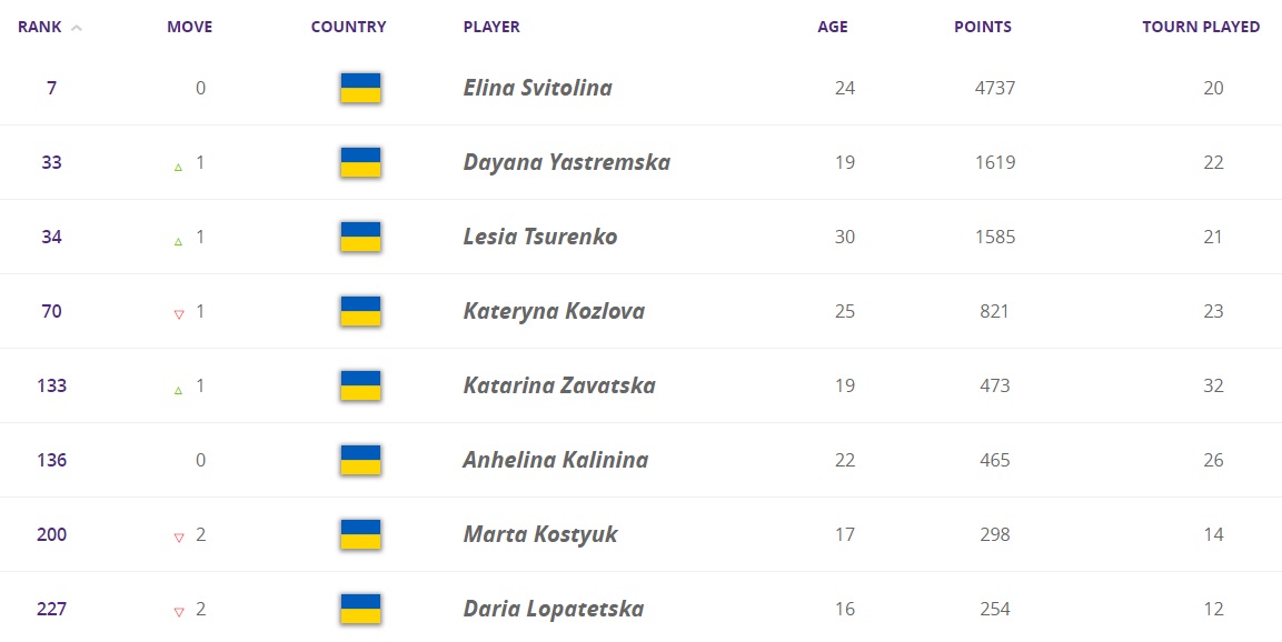 Що стосується українок, то Світоліна і Цуренко здобули по одній перемозі на вищеназваних турнірах, Леся навіть піднялася на одну сходинку. Додала одну позицію і Даяна Ястремська, яка в цей тиждень не грала.