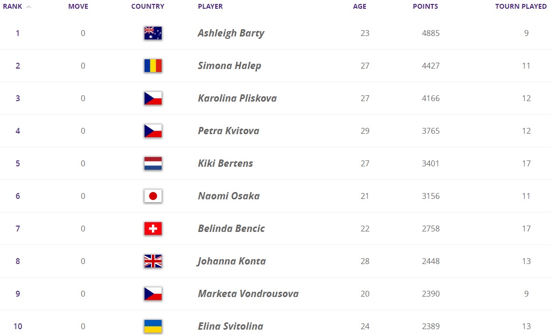 У першій десятці змін не відбулося, хоча Еліна Світоліна була близька до того, щоб обійти Петру Квітову.