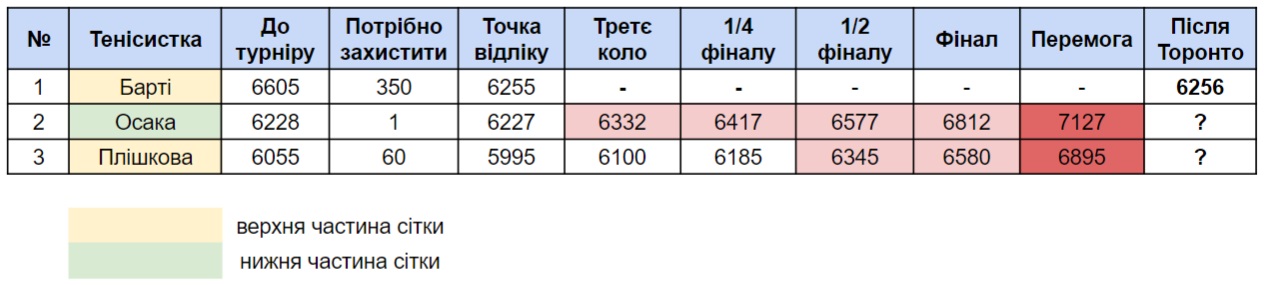 Осаці достатньо буде виграти один матч і виступити не набагато гірше Плішкової (детально можна подивитися в таблиці нижче), а ось чешці потрібно виходити як мінімум до півфіналу і сподіватися на осічку японки.