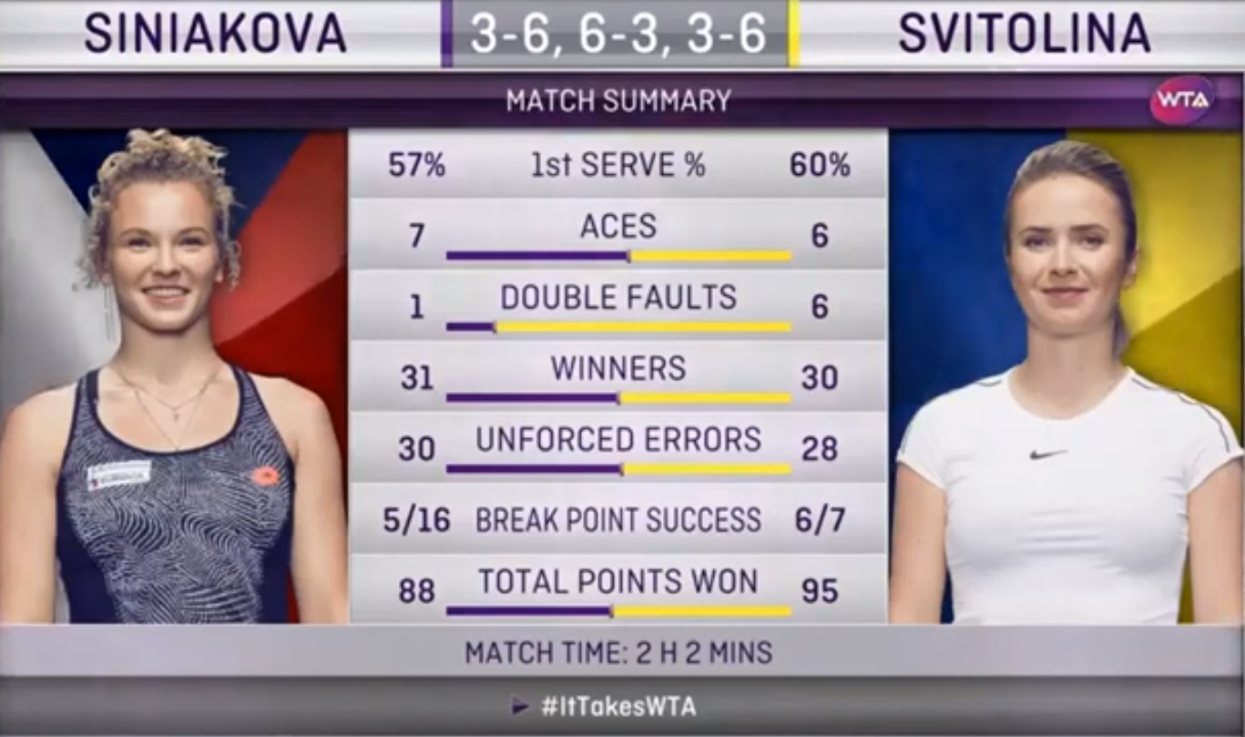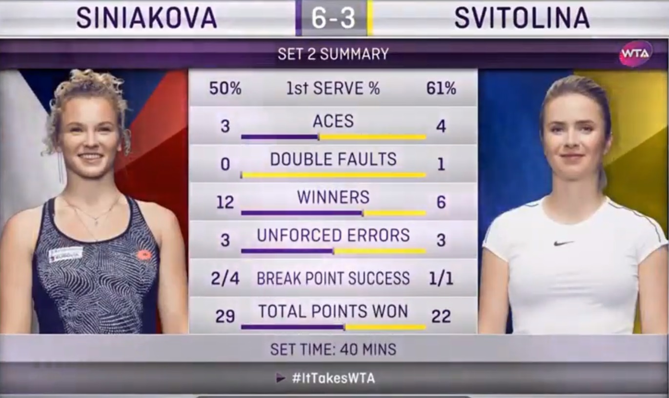 вряди-годи Еліна менше бігала по корту за суперницю - по ходу показували статистику що українка рухалася 27 м за 1 очко, а чешка на 10 м більше, тобто 37 м;