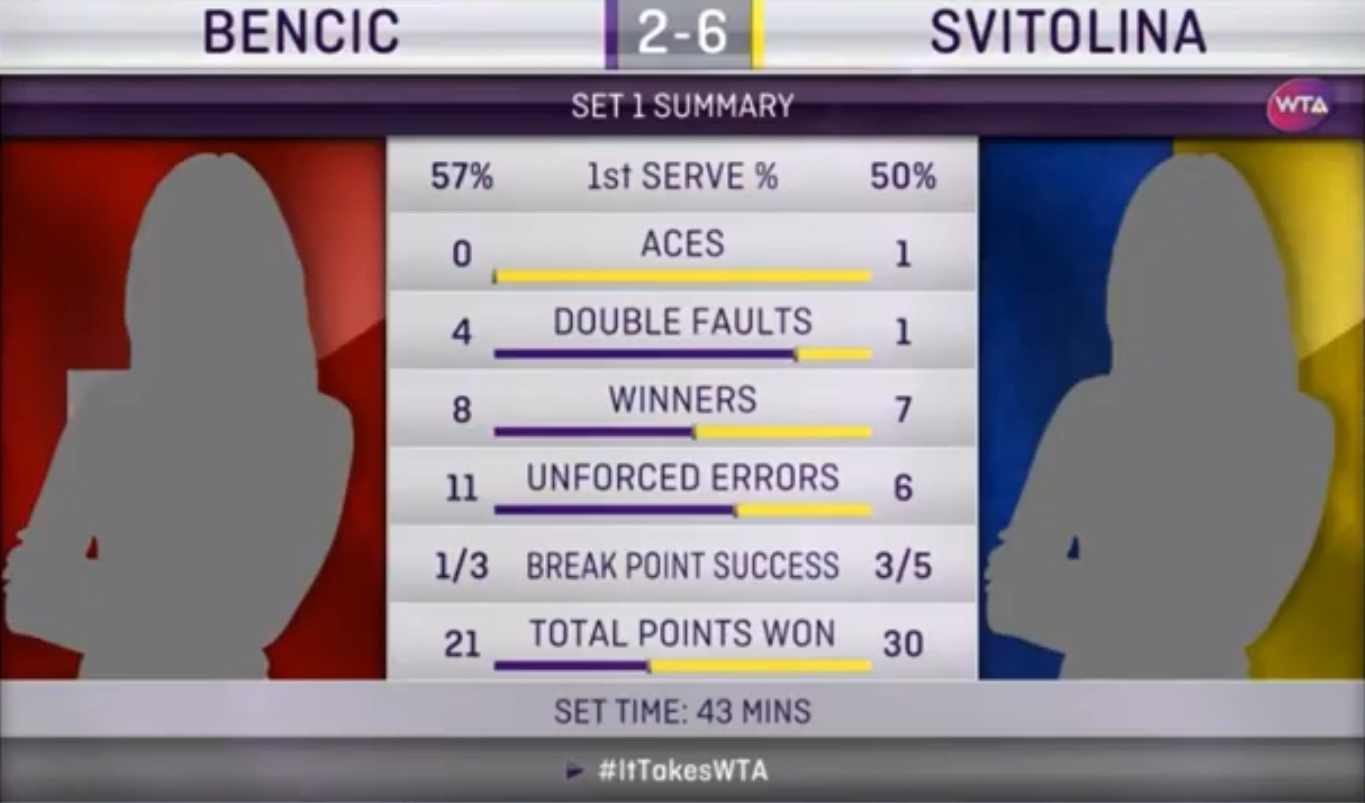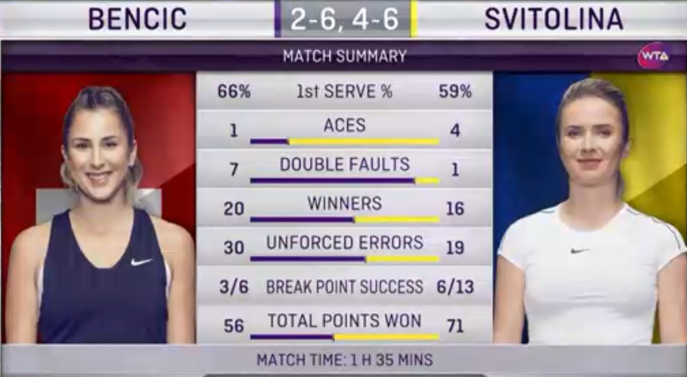 Після перерви Бенчіч заграла трохи краще, зробила брейк, але Світоліна все ж зуміла в супер напруженому сьомому геймі заробити очко на прийомі. Це дозволило виходити подавати на матч. Як ви могли здогадатися, нічого з цього не вийшло і Еліна не змогла реалізувати потрійний матчбол. Друга можливість виникла ще через гейм і тут також було гаряче. Спочатку Белінда відіграла четвертий матчбол, але на п'ятому все ж помилилася при переведенні по лінії.