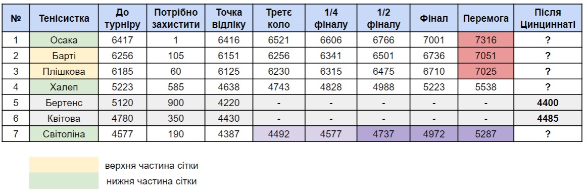 Обидві тенісистки поки що тримаються вище Світоліної в онлайн-рейтингу, але українці достатньо буде здобути лише одну перемогу, щоб піднятися в топ-5. Обійти Еліну в Цинциннаті після зняття Серени Вільямс не може ніхто. Аріна Соболенко в разі завоювання титулу набере тільки 4115 очок.