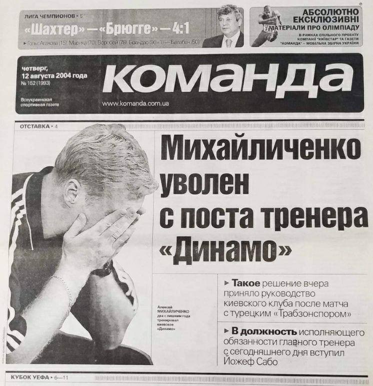 Михайличенко вдруге очолив клуб через 15 років і 4 дні. На архівному фото газети «Команда» від 12.08.2004 – повідомлення про звільнення Олексія.