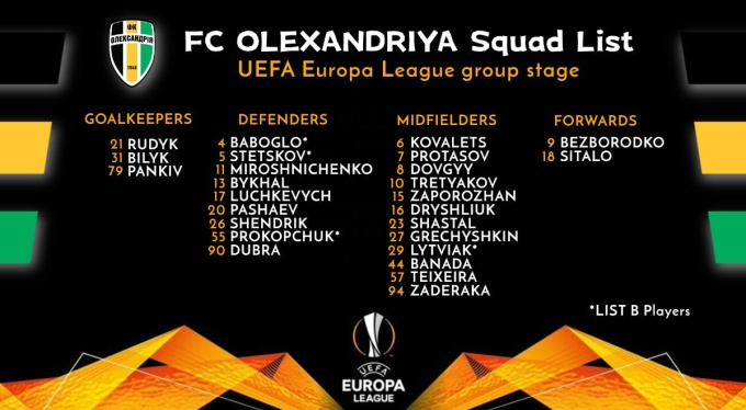 «Олександрія» подала заявку гравців на участь в груповому етапі Ліги Європи, де команді Володимира Шарана випало зіграти з «Сент-Етьєном», «Гентом» і «Вольфсбургом».