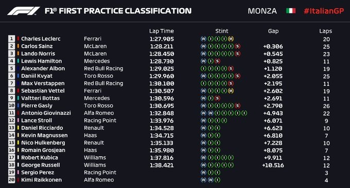 А найкращий час практики показав пілот Феррарі Шарль Леклер. В кінці траса почала підсихати, і гонщики один за іншими покращували результати. Леклер випередив представників Макларена і Льюїса Хемілтона.