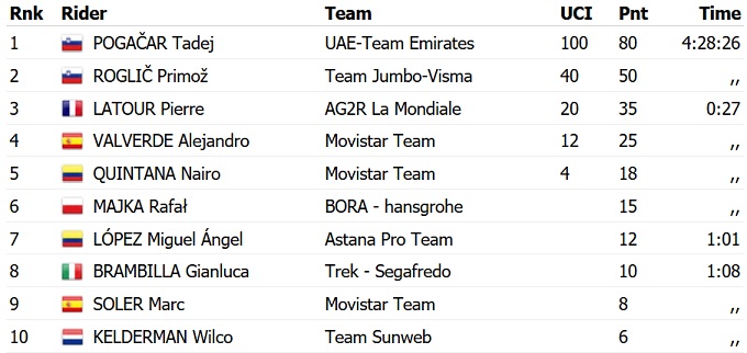 Лідерство в загальному заліку зміцнив інший словенець - Прімож Рогліч з Jumbo Visma, який сьогодні фінішував другим.