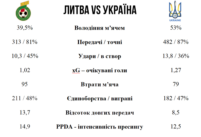 Основною відмінністю між нинішніми збірними Литви та України є те, що команда Андрія Шевченка намагається вести гру сама, а от підопічні Валдаса Урбонаса більш схильні пристосовуватися до дій суперника, вважаючи за краще «танцювати від печі». Все це позначається на ключовій статистиці, яку команди демонструють в нинішньому відбірковому циклі на чемпіонат Європи-2020.