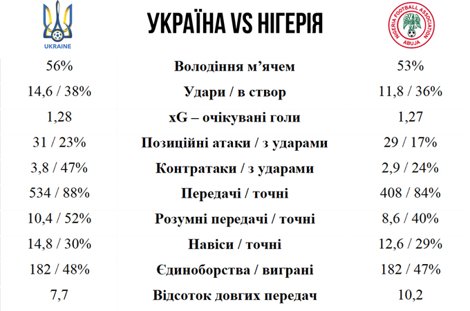 Статистика говорить про те, що Нігерія робить меншу ставку на контроль м'яча, ніж Україна. При цьому, стверджувати що подібний аспект в чомусь іншому вигідно виділяє африканців на тлі «синьо-жовтих» не можна, як мінімум якщо брати до уваги ігрові дані обох команд за 2019 календарний рік.