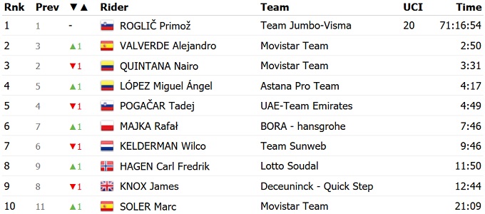 Колумбійський гонщик Education First Серхіо Ігіта став переможцем 18-го етапу Вуельти-2019. Лідером загального заліку залишився Прімож Рогліч, а Мігель Анхель Лопес перехопив у Тадея Погачара білу майку найкращого молодого гонщика і вийшов на четверте місце в генеральній класифікації.