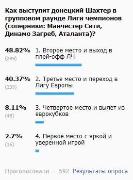 Більшість респондентів (48,8%) прогнозують друге місце для «гірників». У той же час 40,4% уболівальників вважають, що донецький клуб займе 3-тє місце в групі та перейде в Лігу Європи.