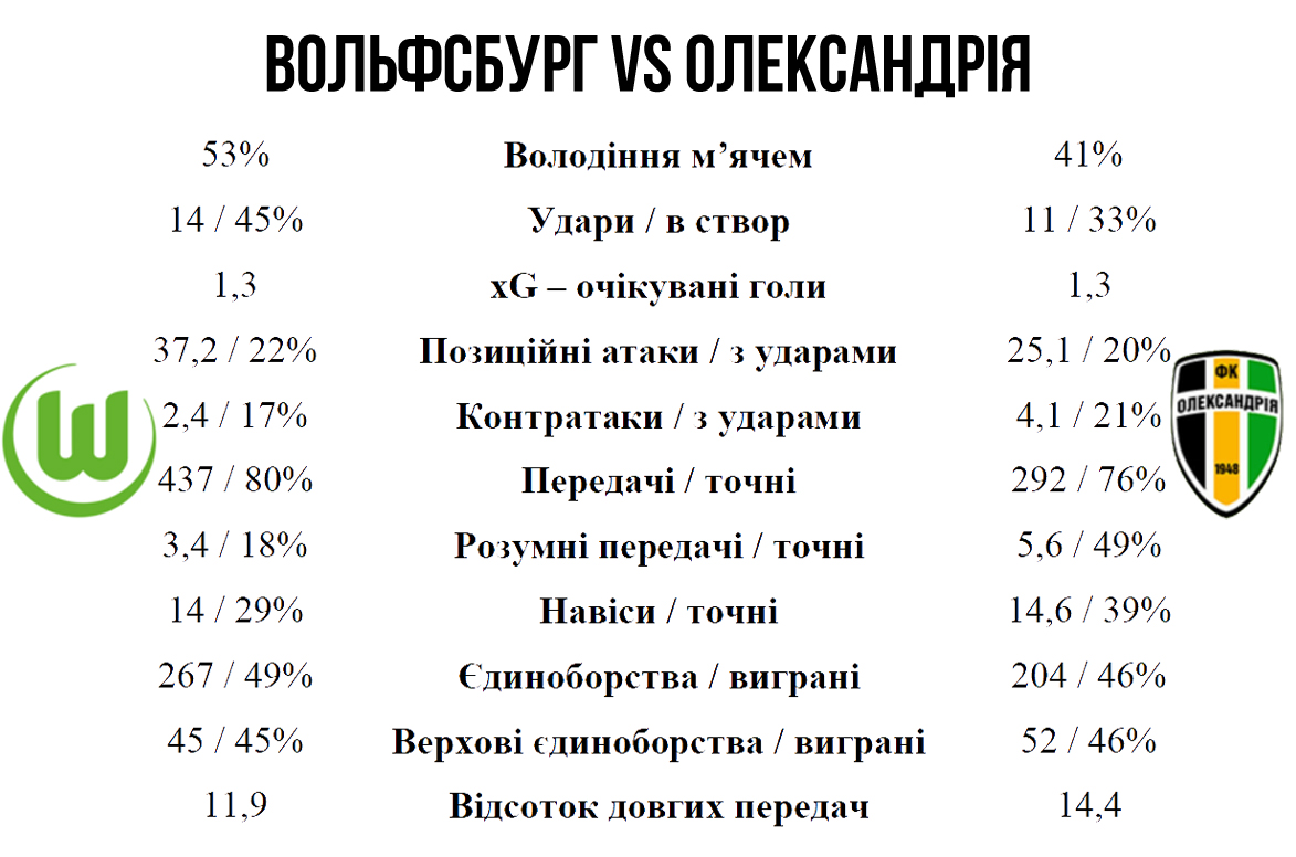 З цих цифр чітко проглядається, що «Вольфсбург» схильний куди більше контролювати м'яч, проводити позиційних атак та здійснювати більше передач, ніж «бронзовий» призер минулого розіграшу УПЛ. «Олександрія», навпаки, робить серйозну ставку на контргру, більше задіює довгі передачі, а також має трохи кращу статистику по верхових єдиноборствах.