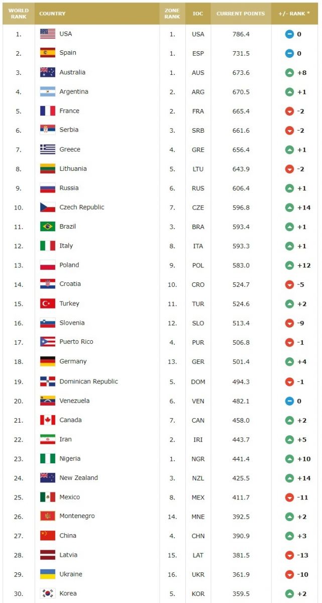 Очолюють рейтинг США, Іспанія та Австралія, яка піднялася відразу на 8 позицій.