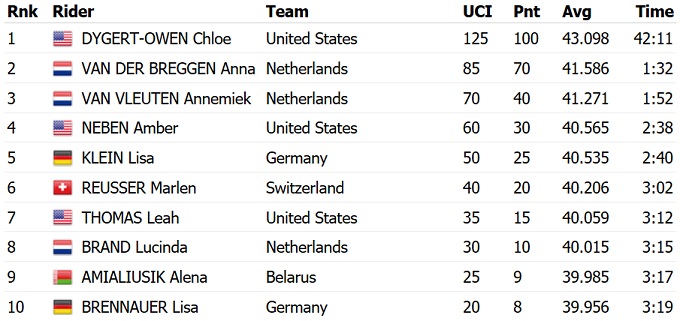 22-річна американка Хлоя Дайгерт стала чемпіонкою світу в гонці з роздільним стартом серед дорослих. Компанію на подіумі їй склали дві голландки - Анна Ван Дер Брегген і Аннемік Ван Флойтен.