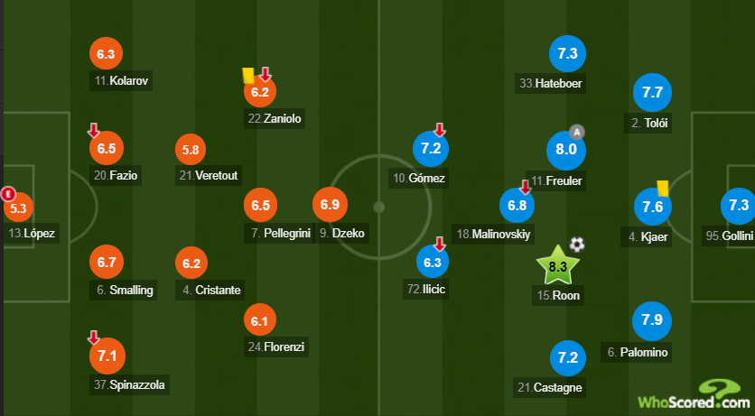 Український півзахисник «Аталанти» Руслан Малиновський отримав невисоку оцінку за матч з «Ромою» (2:0). Авторитетний портал Whoscored оцінив гру 26-річного хавбека оцінкою 6,8, яка стала однією з найнижчих в команді. Нижче оцінки отримали тільки Госенс (6,2) і Пашаліч (6,4).