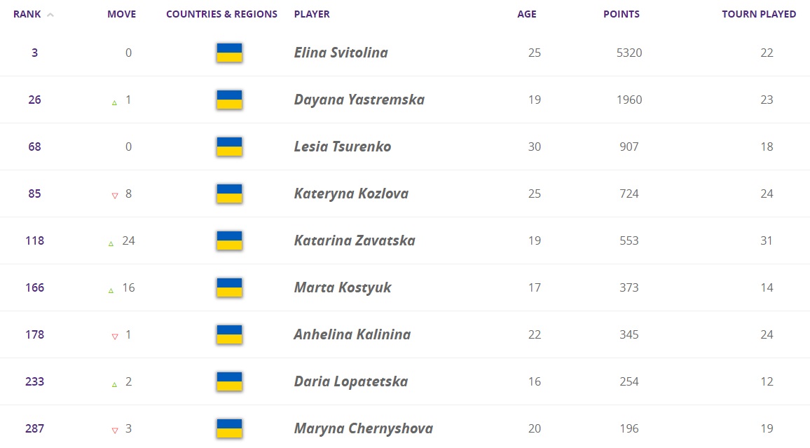 Українки в топ-300 рейтингу WTA