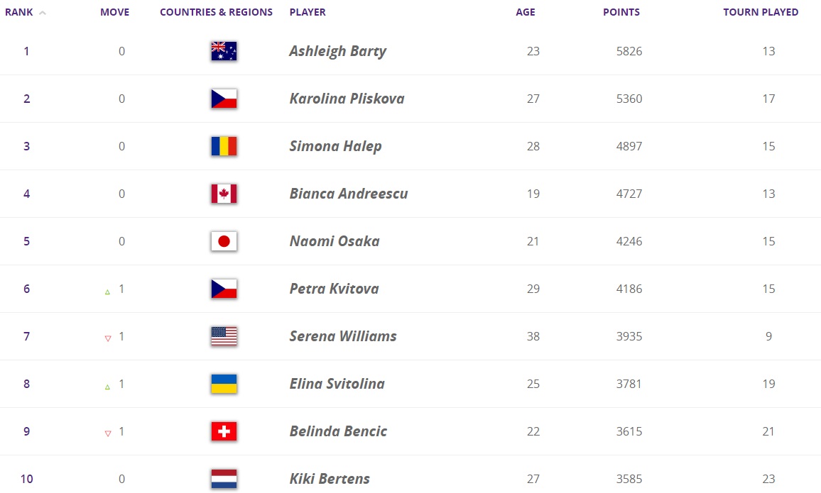 В Чемпіонській гонці Еліна Світоліна повернулася до топ-8, але Белінда Бенчіч і Кікі Бертенс знаходяться на досить близькій відстані і участь в Підсумковому турнірі для українки поки що не забезпечена.