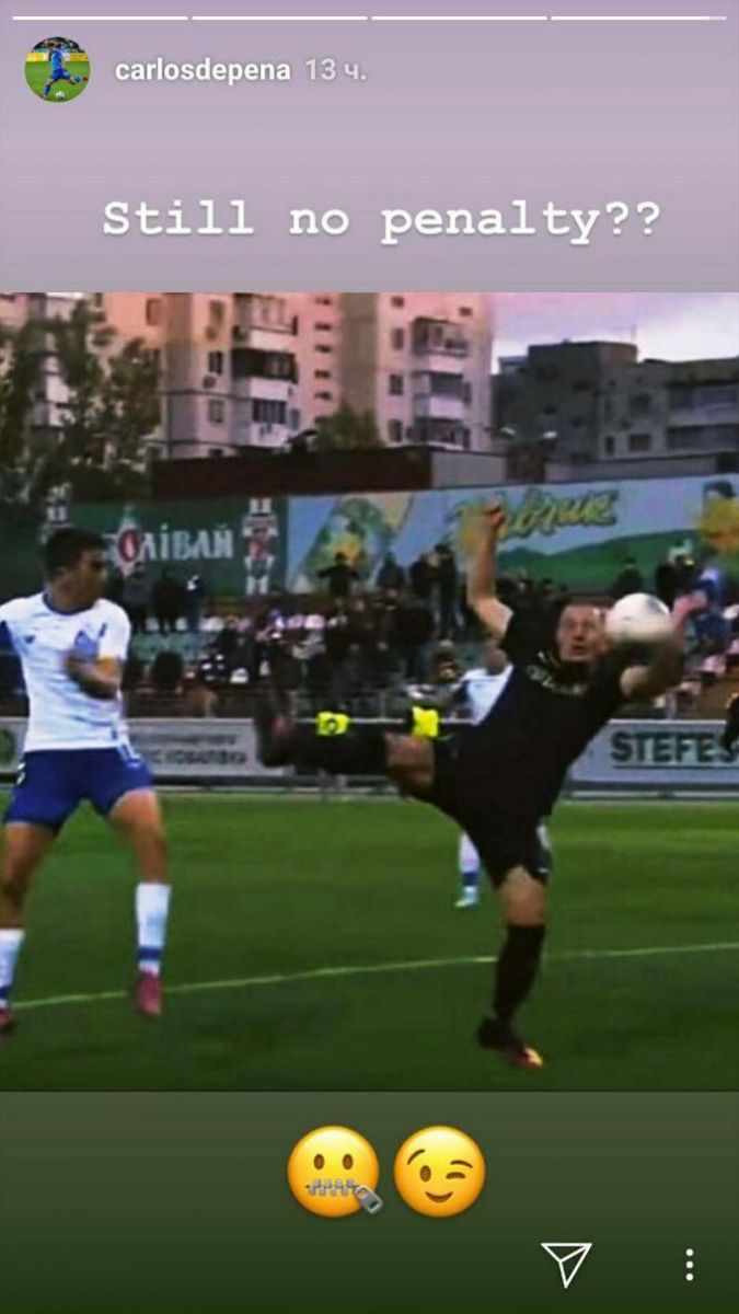 «Все ще не пенальті?», — написав де Пена в Instagram, опублікувавши стоп-кадр трансляції матчу, на якому видно, що м'яч після удару де Пени потрапляє в руку Максименку.