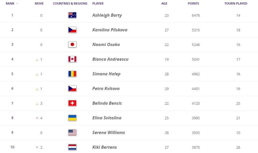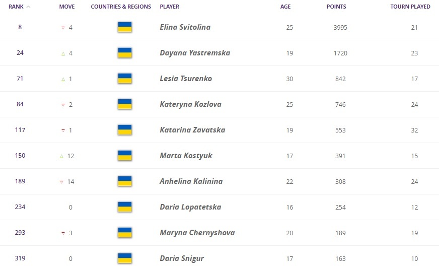 Серед українок Даяна Ястремська, яка минулого тижня відкотилася на 5 місць, в цей раз практично відіграла все своє відставання і зараз піднялася на чотири місця і тепер займає 24-е. Також +12 позицій до рейтингу має Марта Костюк, яка знову увійшла в топ-150.