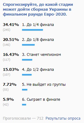 Максимальними оптимістами є 16.4% опитаних, які вірять в абсолютний тріумф збірної України. 15% респондентів вважають, що збірна зупиниться в півфіналі, а 5.9% – що програє лише в фіналі. Песимістично налаштовані 7.7% читачів, які ставлять на невихід національної команди з групового раунду.