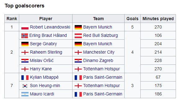 Англійців Рахім Стерлінг зробив хет-трик за «Манчестер Сіті» в грі проти «Аталанти» (5:1). Забивши 4 м'ячі за 3 гри ЛЧ, він ділить друге місце з ще чотирма футболістами. Дубль за «Тоттенхем» провів Гаррі Кейн і також має в активі 4 забитих голи. Хет-трик також зробив форвард «ПСЖ» Кіліан Мбаппе, який повернувся після травми.