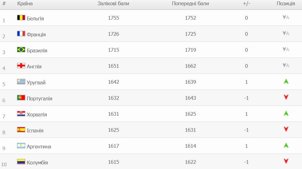 ФІФА оновила рейтинг збірних, в якому збірна України тепер займає 22-е місце.