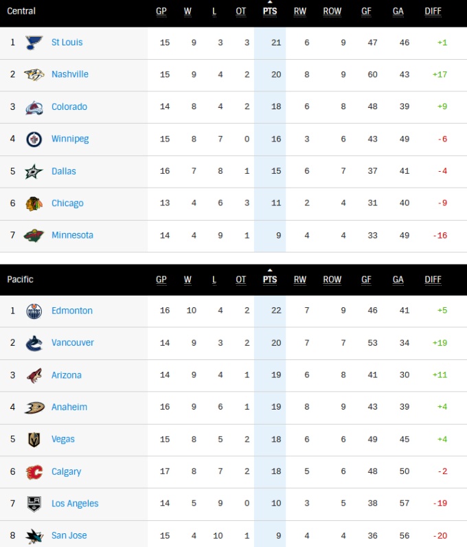 Едмонтону не вистачає стабільності, але дует Леона Драйзайтля і Коннора Макдевіда не може не бути яскравим. Плюс досвідчений Джеймс Ніл, який провалив минулий сезон в Калгарі, на старті цього чемпіонату вже закинув 11 шайб в 15-ти матчах. Поки потужні каліфорнійські команди на зразок Сан-Хосе або Лос-Анджелеса пригальмували, перевагу перехопили молоді суперники.